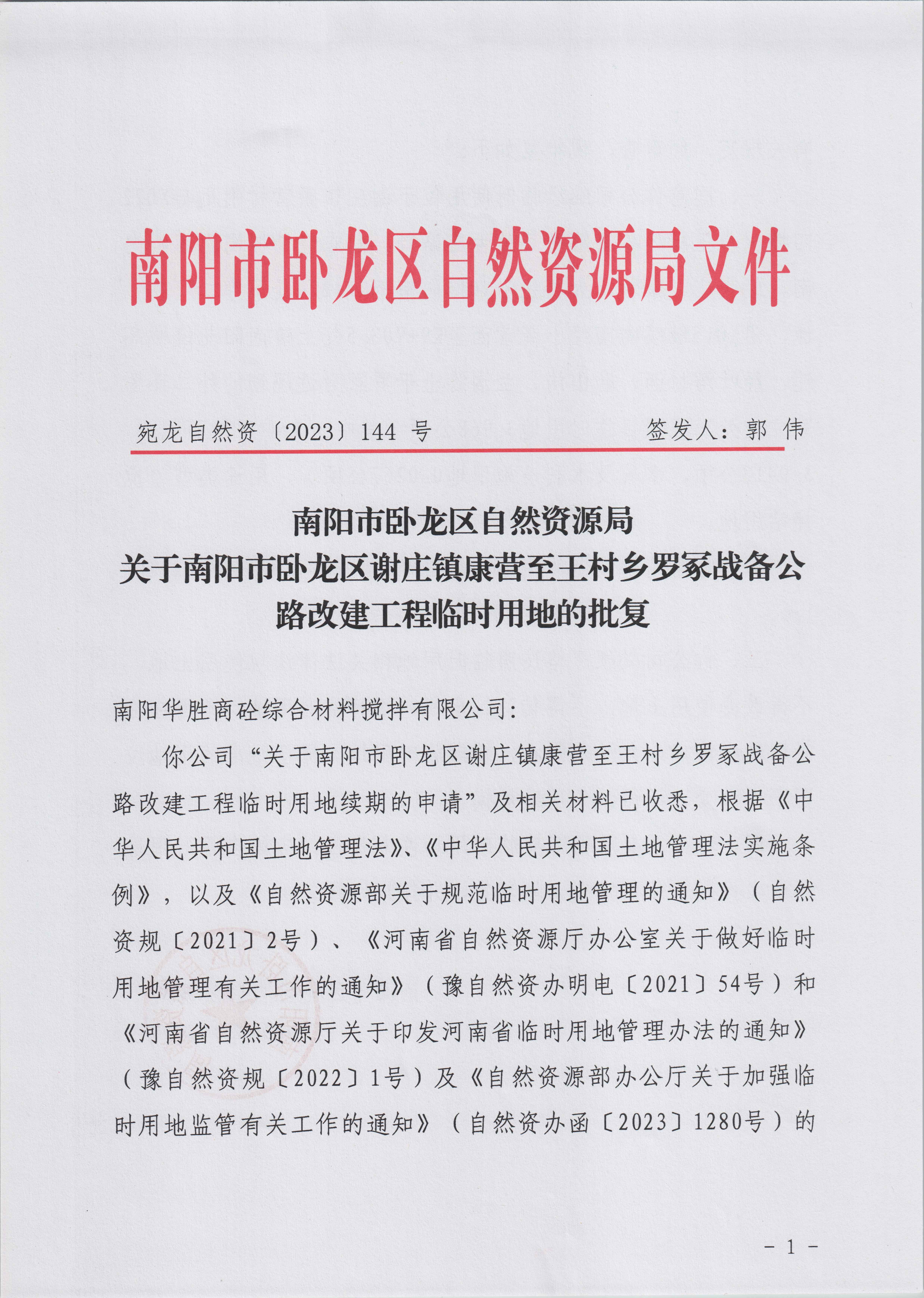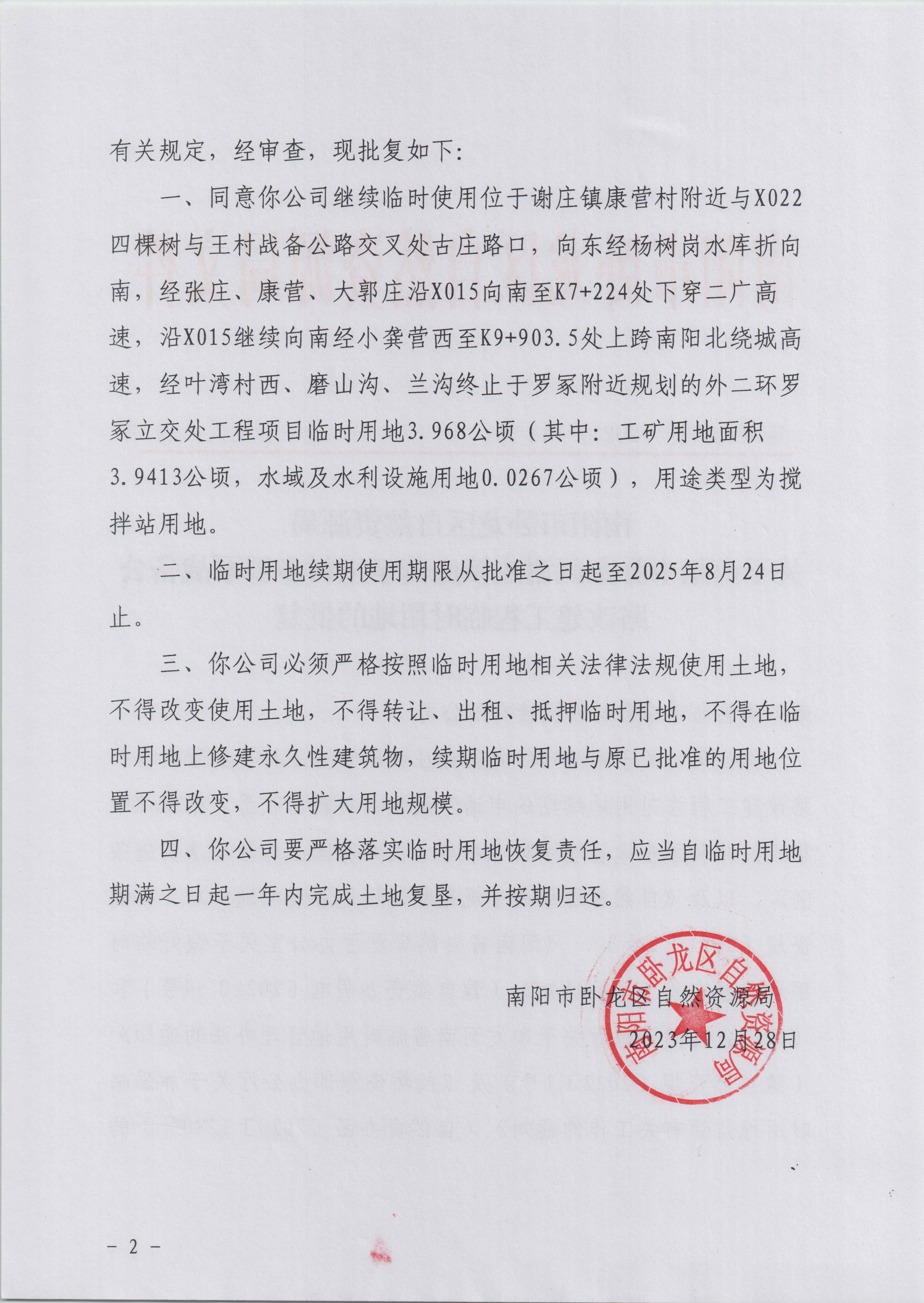 南阳市卧龙区自然资源局关于南阳市卧龙区谢庄镇康营至王村乡罗冢战备公路改建工程临时用地的批复.pdf