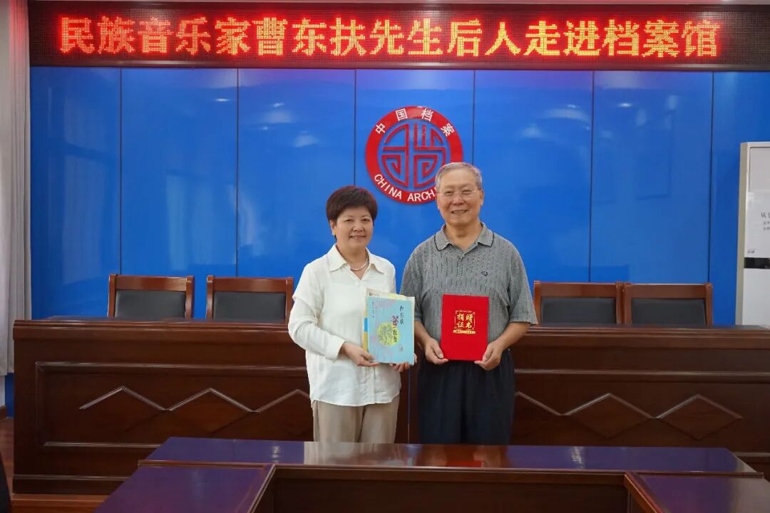 曹永安一行参观后,将《曹东扶筝曲集》以及纪念曹东扶诞辰演奏资料捐赠到档案馆,同时表示曹东扶先生是从南阳盆地走出去一代民族宗师,将曹东扶资料回馈故乡,一定意义上也是一种心灵归乡,感谢档案馆为曹东扶先生建立全宗档案,曹永安表示随后搜寻整理曹先生有关资料,将陆续捐给档案馆,让更多研究者有迹可寻,使古宛大地弦歌不辍,更好传承发扬繁荣家乡曲艺事业。