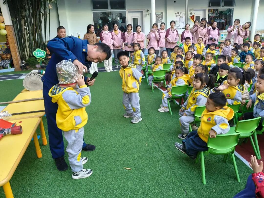 活动现场,消防员结合幼儿认知特点,通过情景模拟、趣味问答、亲身体验、实操演示等丰富形式,用通俗易懂的语言向孩子们讲解火灾危害、火场逃生技巧及“119”报警电话的正确使用方法。在互动体验环节,孩子们化身“小小消防员”,兴奋地佩戴消防面罩,亲身感受消防装备的重量,纷纷感叹“原来这么重呀,消防员叔叔太辛苦了”。工作人员适时抛出“发现起火要及时告知谁”“火警电话需要花钱吗”等问题,小朋友们踊跃举手抢答,在轻松愉悦的氛围中巩固消防安全知识,掌握实用应急技能。