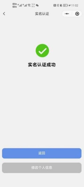 填写完本业全部信息后,点击最下方提交按钮,将会提交相关信息,并进行人脸识别,如图 4 所示。人脸识别完成后,将提示实名认证成功,如图 5 所示。如个人信息填写有误,可点击修改个人信息进行修改。