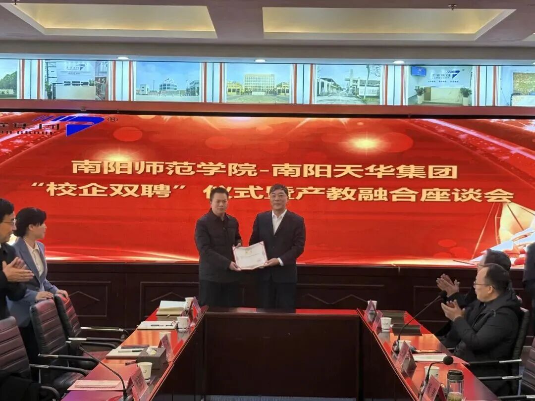 “校企双聘”是指校企联合引才、育才和用才,实行“编制在高校、工作在企业”模式。校企双方共同制定人才标准、共同承担引才成本,实现高层次人才资源优化配置。此次活动是南阳师范学院孔伟光博士到卧龙区天华集团工作的聘任仪式。