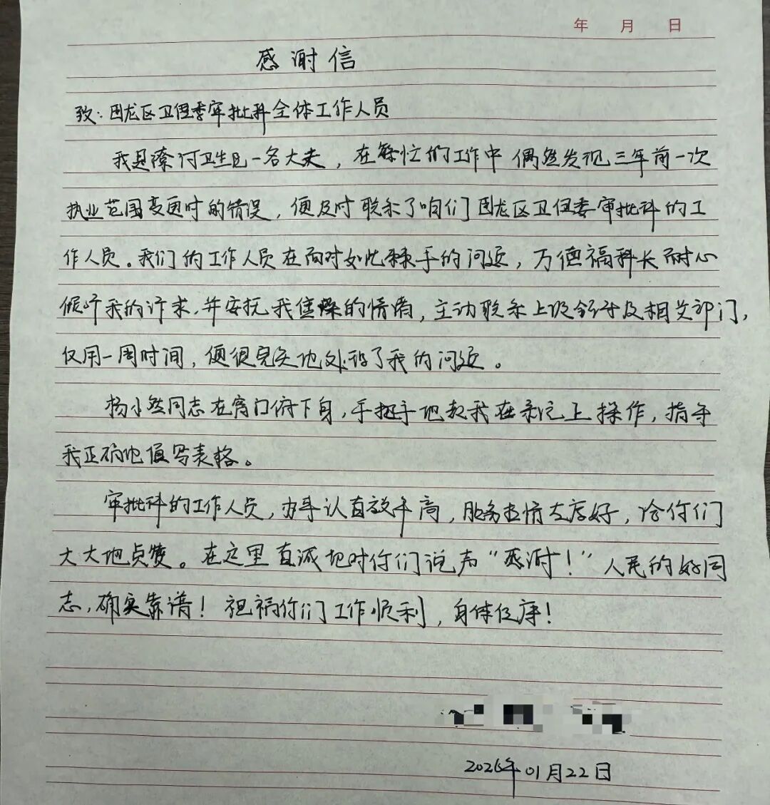 在日常忙碌的诊疗工作中,李医生偶然发现了自己三年前执业范围变更时的一处疏漏。抱着试试看的心态,她拨通了区政务服务中心卫健委窗口电话。让李医生没想到的是,面对这一历史遗留问题,万德福科长耐心倾听、安抚情绪,主动牵头对接上级部门及相关单位,窗口工作人员杨小然同志手把手带着她在系统上一步步操作,细致指导表格填写的每一处细节,一周后问题得到了彻底解决。让李医生感受到了家人般的亲切与贴心。
