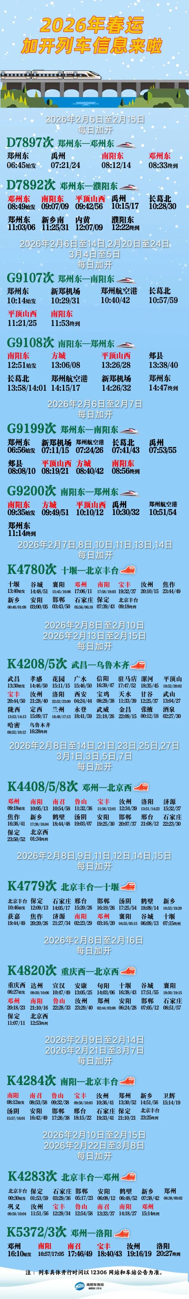 为满足春运期间旅客出行需求根据客流情况南阳车务段管内节前将加开临客列车,具体车次信息如下: