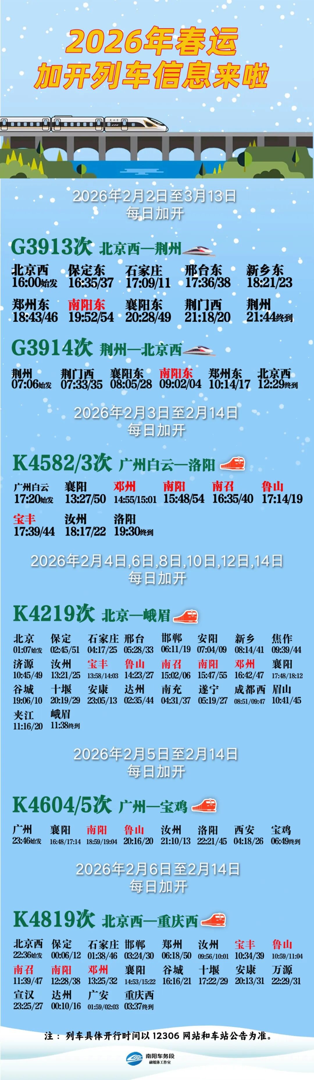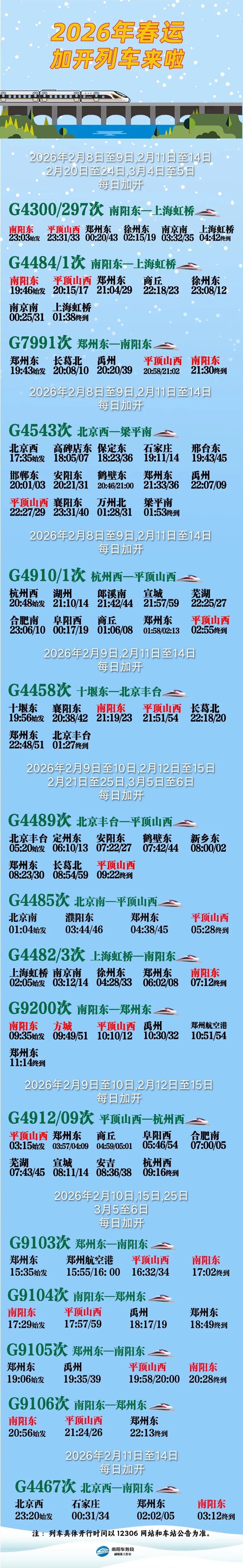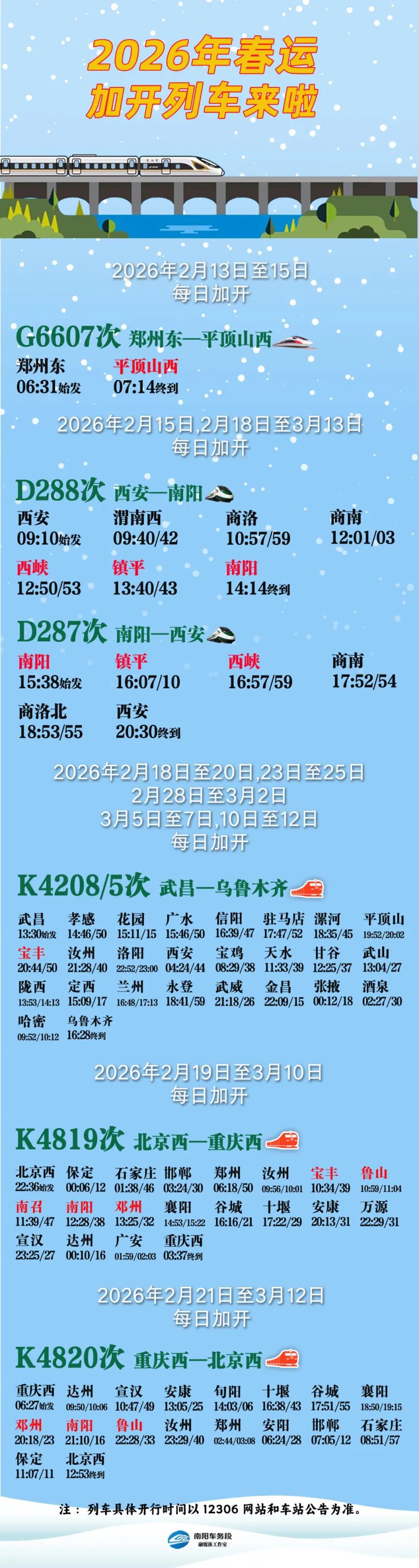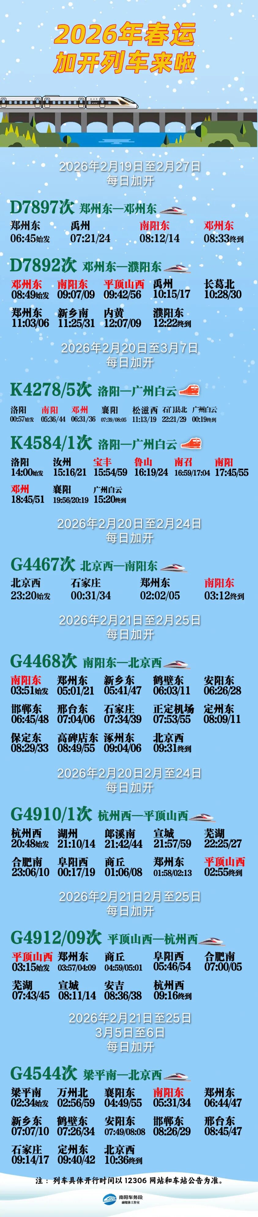 郑铁南阳车务段春运加开列车信息