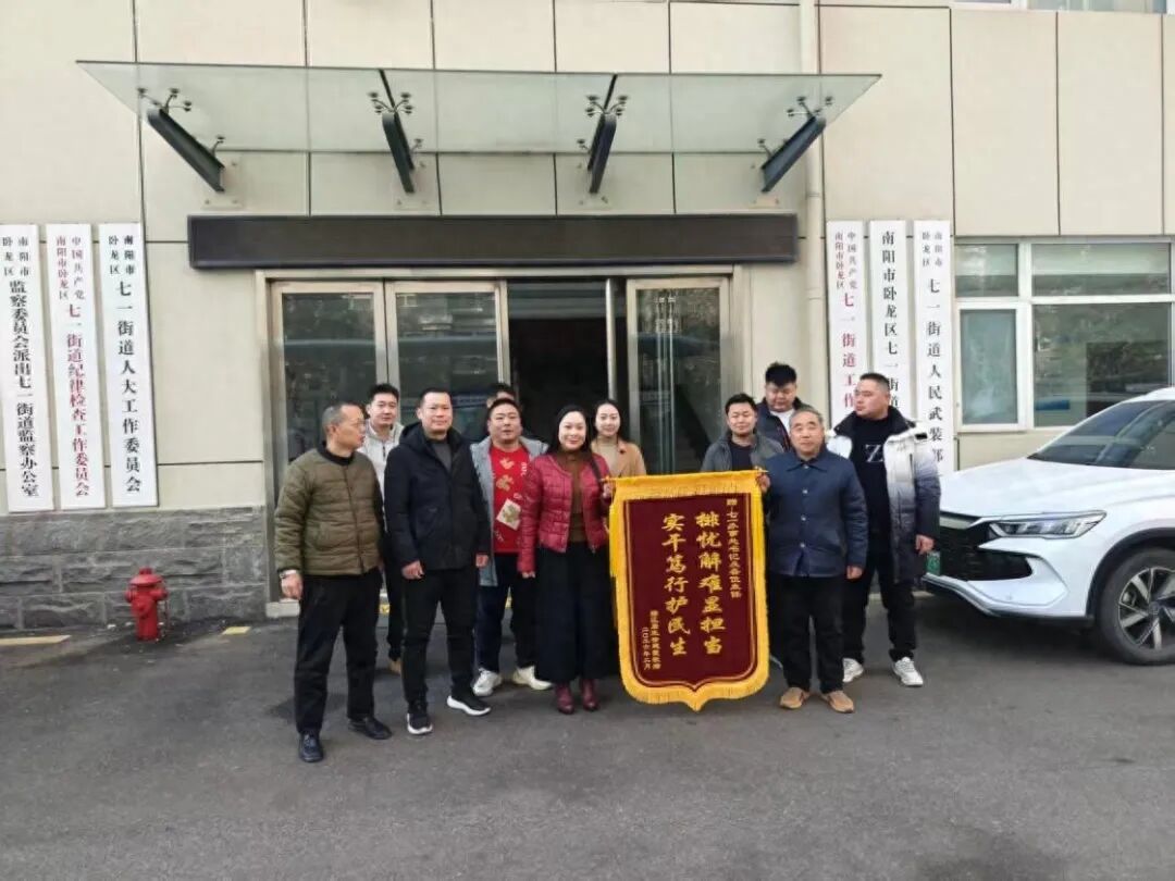 2月14日上午,辖区商户一行专程来到卧龙区七一街道办事处,将一面印着“排忧解难显担当 实干笃行护民生”的锦旗送到工作人员的手中,以最真挚的方式,感谢街道主动作为、高效化解租金纠纷,为商户经营保驾护航、用心优化辖区营商环境。