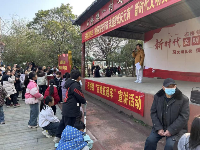 活动现场张灯结彩,喜气洋洋,处处洋溢着浓厚的节日氛围。石桥镇“百姓直通车”理论政策宣讲紧扣群众需求,用乡音传递“党音”,将“高大上”的政策理论转化为“接地气”的家常话语,开展了一场内容丰富的“流动宣讲课”。