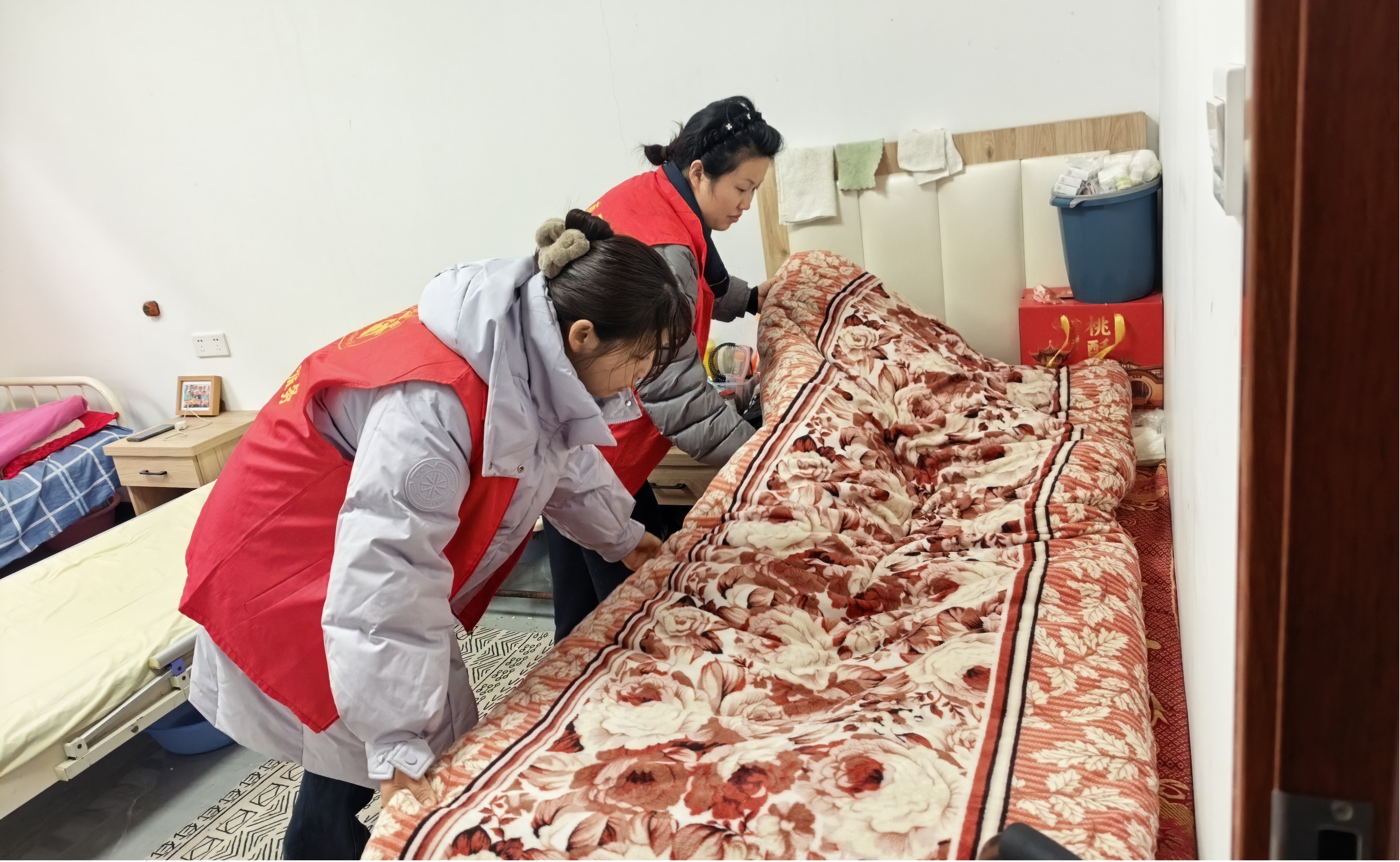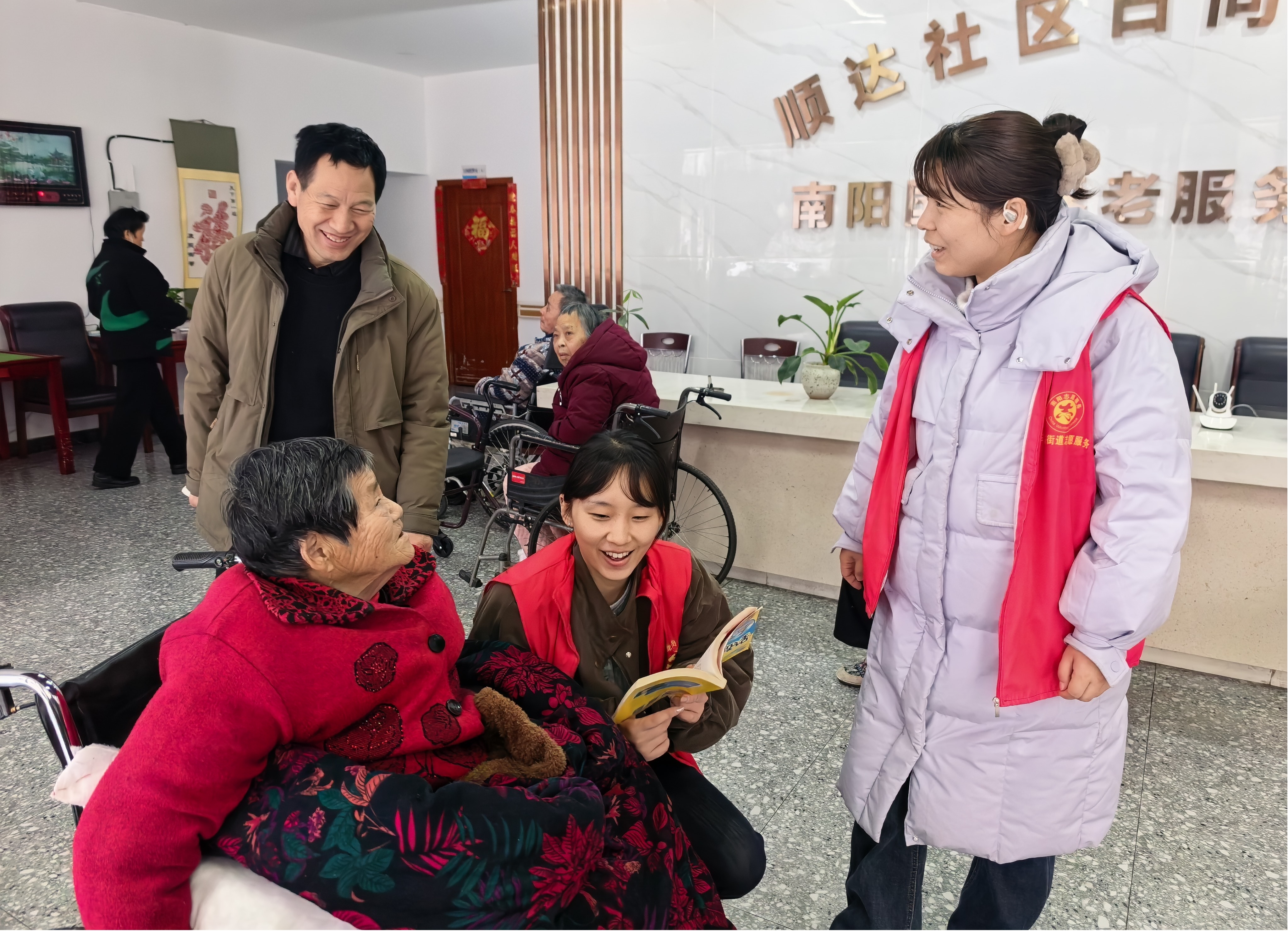 活动中,志愿者们以贴心服务陪伴老人。大家分工协作,有的帮助老人整理床铺、打扫照料中心环境卫生,为老人营造干净舒适的生活环境;有的围坐在老人身边,耐心倾听老人的心声,细致询问身体状况和生活需求,为老人梳头、推轮椅,用温暖的陪伴舒缓老人孤独情绪;还有的志愿者为老人读报、讲解健康养生和防诈骗知识,守护老人安全。现场氛围温馨融洽,老人们脸上洋溢着幸福的笑容。