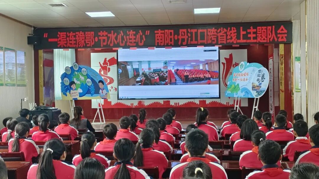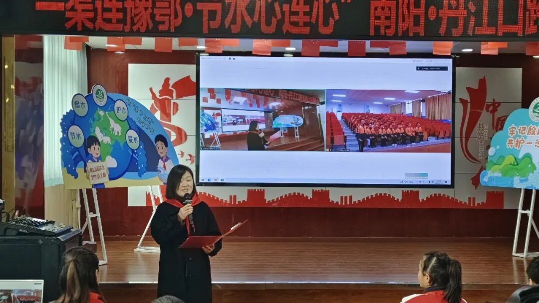 最动人的环节当属“连线互动·水来到我们身边”。丹江口市实验小学的队员深情讲述家乡人民守护水源的感人故事,南阳市第二十三小学的队员则分享了保护水源、节约用水的典型做法。学生发言后,南阳市节水服务中心的工作人员现场向队员们讲解科学用水、日常节水实用妙招,号召大家从身边小事做起,珍惜每一滴水。屏幕内外,两地队员频频互动,护水共识在交流中凝聚。