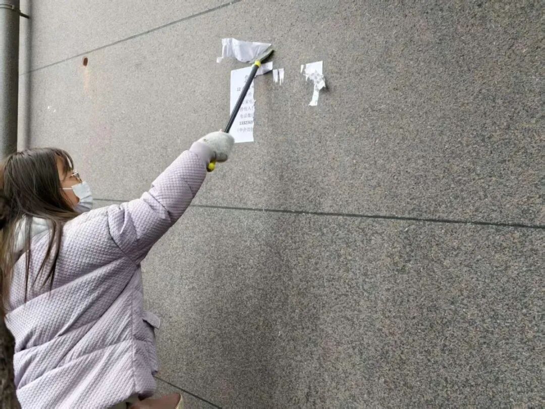 清理小广告,美化家园焕新颜。针对楼道、墙面、公共设施上的小广告,网格员携带铲刀、除胶剂、喷漆等工具,分片包干、逐楼清理。对顽固粘贴的“城市牛皮癣”,采用浸润、刮除、擦拭闭环作业,不留死角、不留痕迹。清理同时,向居民宣传文明公约,倡导抵制乱贴乱画,共同维护公共环境,形成“人人参与、共建共享”的良好氛围。