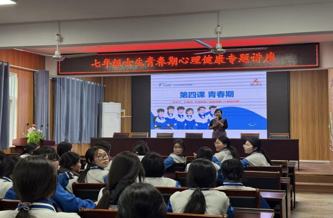 在谢庄一中,专业社工师面向七年级女生开展青春期心理健康专题讲座。结合女生身心发展特点,社工用通俗语言讲解生理变化、情绪管理、自我保护等知识,通过互动提问、案例分享,引导同学们正视成长变化,掌握心理调适方法。针对隐私保护、人际交往等困惑,社工耐心解答,鼓励大家接纳自我、树立自信,以积极心态应对青春期挑战。