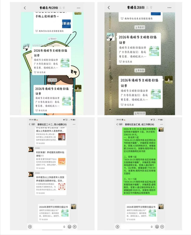 社区坚持宣传先行、全域覆盖,线上依托居民微信群、网格服务群等平台,精准推送文明祭扫倡议书,将绿色祭扫、安全祭扫的理念传递到每一户家庭,引导居民通过鲜花祭扫、网络祭扫、家庭追思等文明低碳的祭扫方式代替传统的焚烧纸钱、燃放鞭炮;线下在社区宣传栏、小区出入口、主次干道等醒目位置张贴宣传横幅、摆放宣传展板,全方位、多角度营造“文明祭扫、平安清明”的浓厚氛围,细致提醒居民遵守祭扫安全规范,严防火灾事故发生。