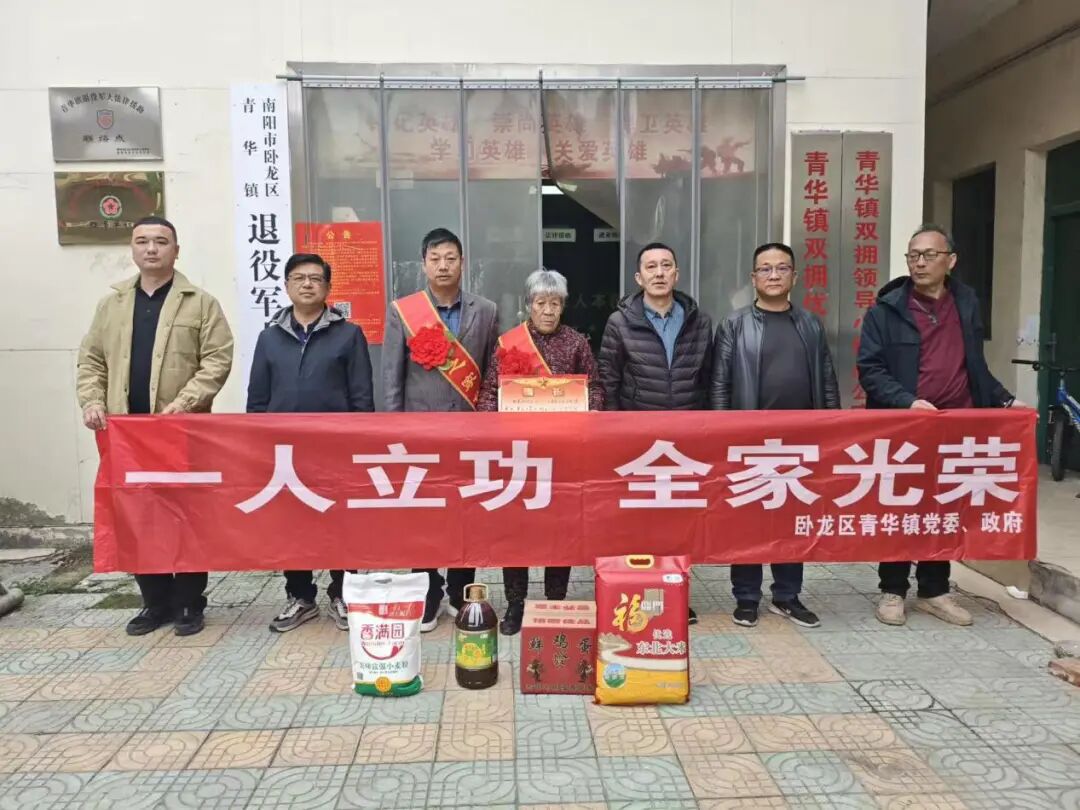 为大力弘扬拥军优属、拥政爱民的光荣传统,3月27日,青华镇联合卧龙区退役军人事务局共同组建慰问组,深入辖区开展走访慰问,为荣立三等功的副营级现役军人邢英战家属送去立功喜报与诚挚关怀,将党和政府的温暖送到功臣手中。