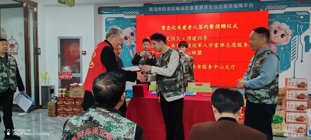 3月31日上午,常态化关爱老人签约暨星光爱心联盟捐赠仪式在卧龙区梅溪街道综合养老服务中心大厅温情启幕。卧龙区民政局、卧龙区梅溪街道办事处,幸福社区有关负责人,南阳市志愿服务总队代表、星光爱心联盟代表及养老服务中心全体工作人员、长者代表共同参与本次活动。
