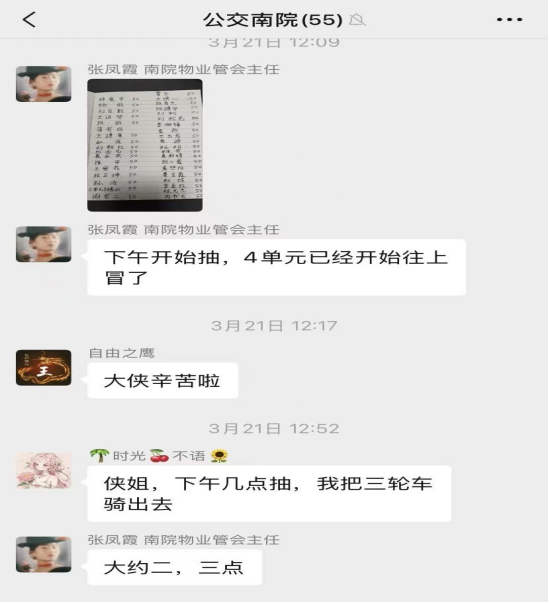 她第一时间对接社区、公交公司及大修厂,排查堵塞根源。经核实,南院化粪池与大修厂独立管网不互通,与地势更高的北院共用一套排污系统,堵塞问题根源在共用管网。为尽快解决问题,张凤霞在南院业主群内发起倡议,同时主动对接北院物业与居民,耐心沟通两院共用管网的现状与清污的必要性,最终推动南北两院达成一致,共同出资清理共用化粪池,彻底解决了资金协调难题。