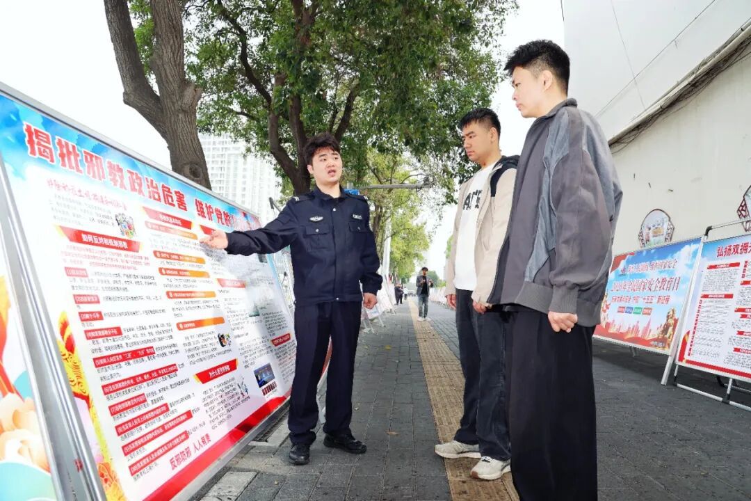 4月15日上午,分局组织民辅警参加了在卧龙区文化路举办的全民国家安全教育日集中宣传活动,活动现场,通过摆放宣传展板、悬挂宣传横幅、发放宣传手册、面对面讲解等方式,民警用通俗易懂的语言向群众讲解总体国家安全观内涵及相关领域知识,同时,结合公安机关职能,宣讲民警重点围绕反邪教、网络安全、防范个人信息泄露等内容,向过往群众普及《中华人民共和国数据安全法》等国家安全相关法律法规,讲解反诈防毒、网络安全、反对邪教、反恐防控等实用知识,深刻揭批邪教的骗人伎俩、现实危害及政治本质。