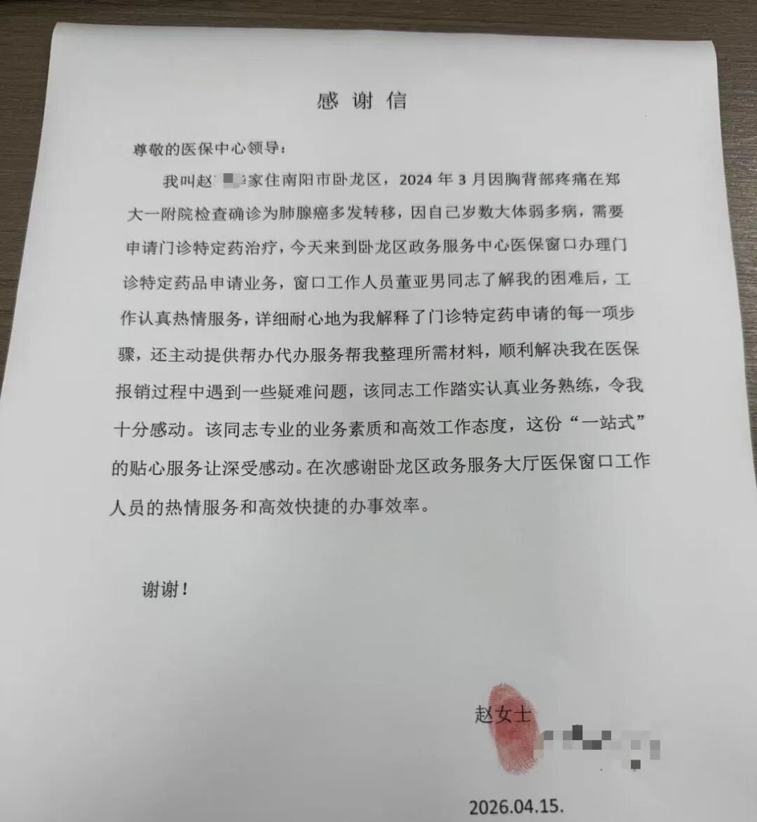 这封感谢信,既是群众对医保服务的认可,也是对政务服务深化改革、暖心惠民的肯定。近年来,卧龙区政务服务中心紧扣“放管服”改革要求,持续优化服务流程、精简办事环节,全力推动“数据多跑路,群众少跑腿”,切实提升经办服务质效,用专业与暖心为群众办实事、解难题。