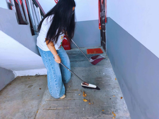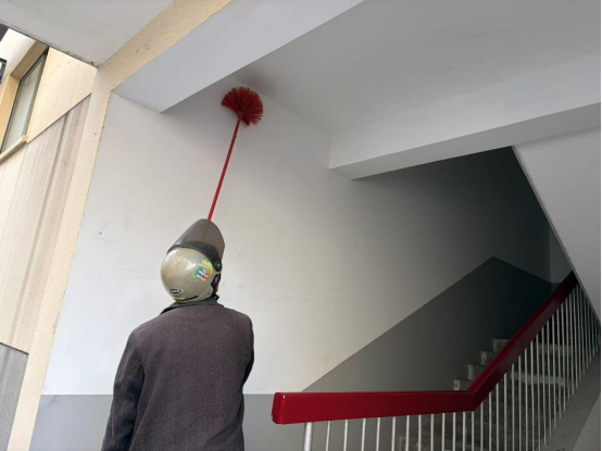 此次行动重点整治小区楼道、楼院等公共区域,工作人员与志愿者分工明确、默契配合,手持扫帚、抹布等工具,细致清理楼道内堆积的杂物、散落的生活垃圾,逐一清除墙面、天花板及拐角处的蜘蛛网,认真擦拭楼道扶手、窗台边框,着力解决居民反映强烈的环境卫生痛点问题,让小区公共区域“净起来、亮起来、舒起来”。