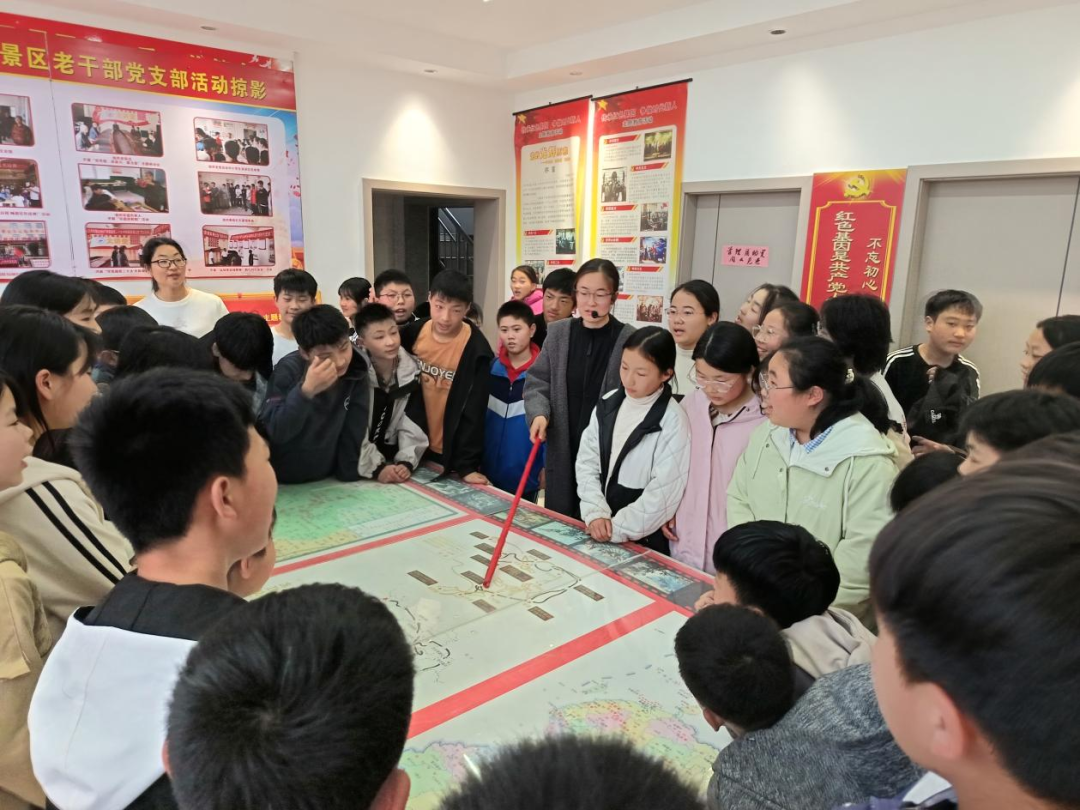 活动现场,红色教育与家乡文化传承深度融合,内容丰富、形式鲜活。在红色传承教育环节,师生们一同走进景区红色教育基地,在庄重肃穆的氛围中,参观党史与红色故事展览。关工委“五老”宣讲员结合本地红色历史,深情讲述革命先辈浴血奋战、坚守初心的英勇事迹,带领同学们回望波澜壮阔的革命岁月,感悟今日幸福生活的来之不易,让红色基因深深扎根在每一位青少年心中,进一步筑牢青少年的理想信念根基。