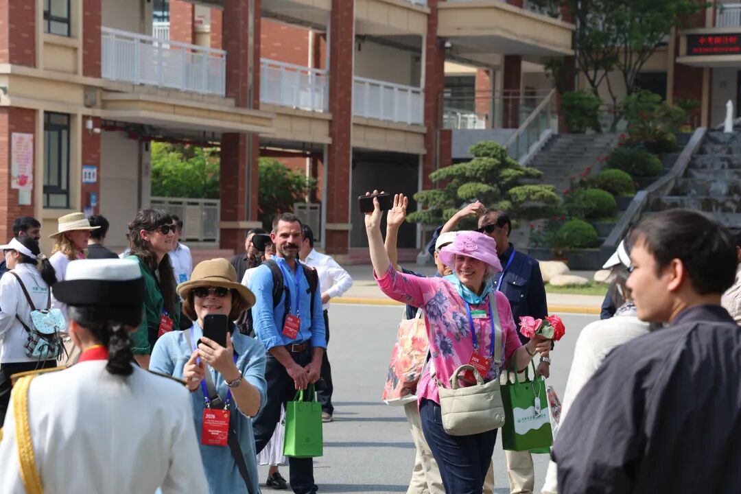 当天下午2时10分,嘉宾们步入校园。60名经过系统培训的师生讲解员用流利的中英文双语,从容自信地向远道而来的客人介绍学校的月季文化与中医药教育特色。从月季的品种分类到中医药的“药食同源”理念,从校园的“四美庭院”景观到“向下扎根,向上生长”的办学理念,讲解员们娓娓道来。