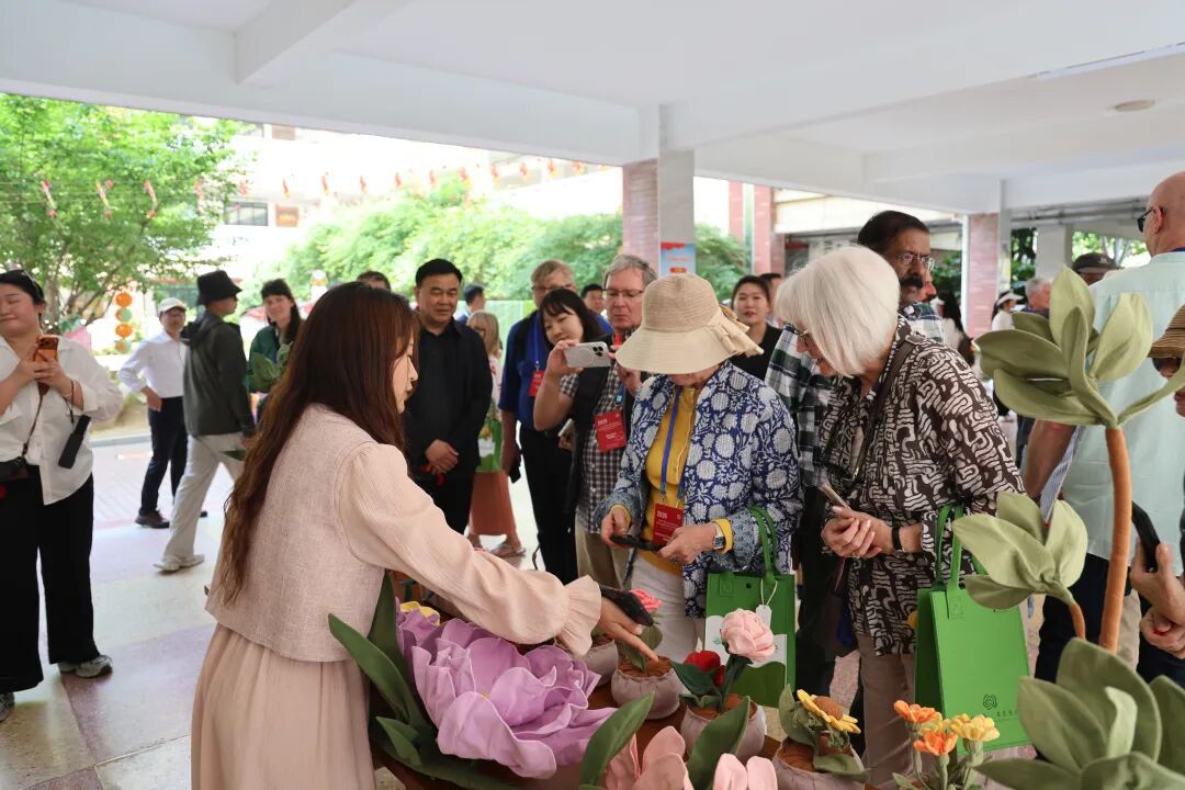 在60分钟的参观时间里,嘉宾们先后走过9个核心点位,全方位感受学校的文化底蕴与育人成果。“小云雀”合唱团孩子们演唱的《月季之歌》清澈悠扬,为参观拉开序幕。八段锦校队展示传统养生功法,一招一式尽显东方智慧;非遗风筝、扭扭棒手工、剪纸等学生作品,将月季之美以童真方式呈现。来宾与孩子们共同体验剪纸、布艺花卉制作,现场气氛热烈。民乐团锣鼓铿锵,《茉莉花》丝竹悠扬,传统民乐成为沟通无国界的语言。中医药社团讲解仲景文化,扎染社团邀请嘉宾亲手体验植物草木染,书法、国画社团展示笔墨丹青。传统技艺与现代教育在此交融,文化传承的种子在孩子们心中生根发芽。
